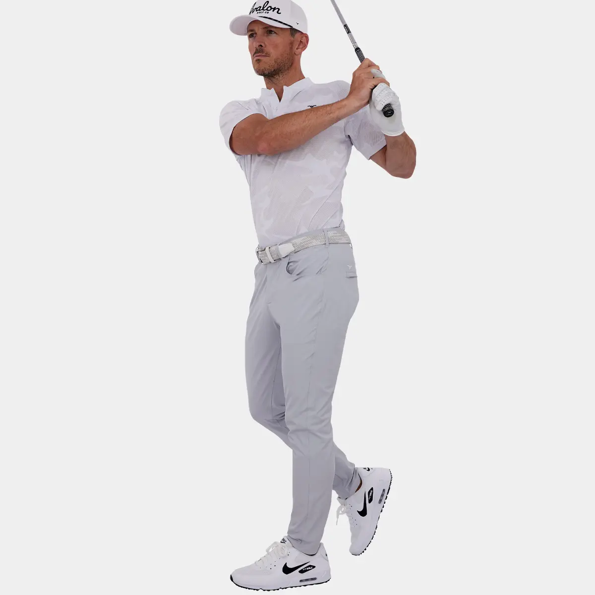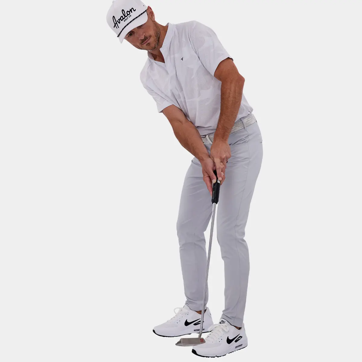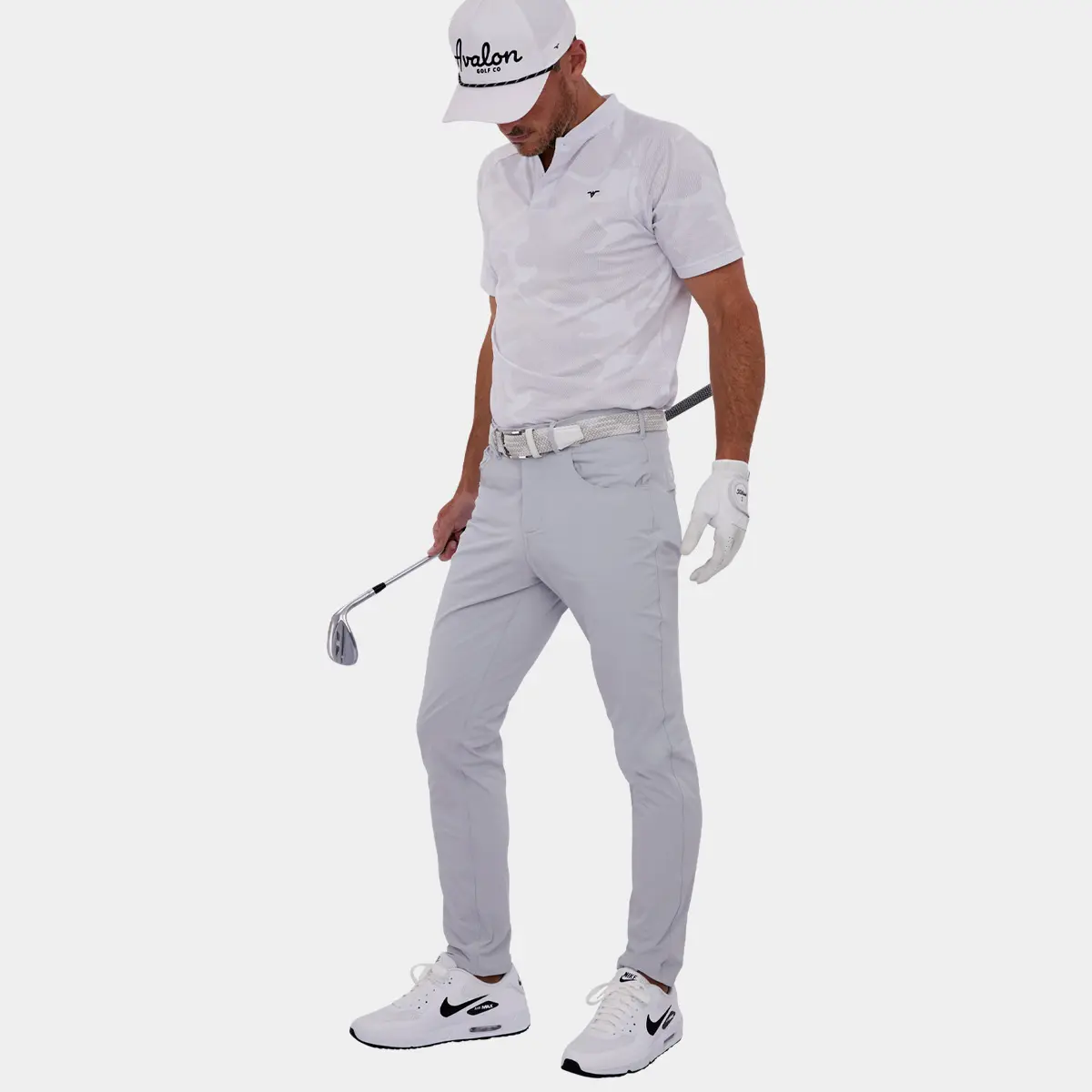 The Avalon Tour Slim Fit Golf Pants in Light Gray are designed for men and offer a traditional take on our best selling golf joggers. Cut from our ultra-technical AVG Tour Fabric ®, a proprietary blend of Polyamide & Elastane, the Tour Pant is lightweight to keep you cool and buttery soft for all day comfort. It features UPF 50+ for sun protection, moisture wicking, breathable and a 4 way responsive hyper stretch to move with you. We’ve expertly tailored these slim fit golf pants as a modern luxury fit with tapered legs and slimmer leg openings. Quality, craftmanship & durability was a focal point during design and we’ve reinforced all seams, double stitched stretch points & used high quality trim such as a YKK zipper and electroplated button. We designed without compromise to make the best men’s golf pants. Finishing touches include an inner silicon grip waistband to keep shirts tucked, durable yet soft mesh pocket liners and 5 pockets (including a back zipper pocket & front inner ‘ball marker’ pocket). The Avalon Tour Slim Fit Golf Pants while designed for golf, will function even beyond the course.